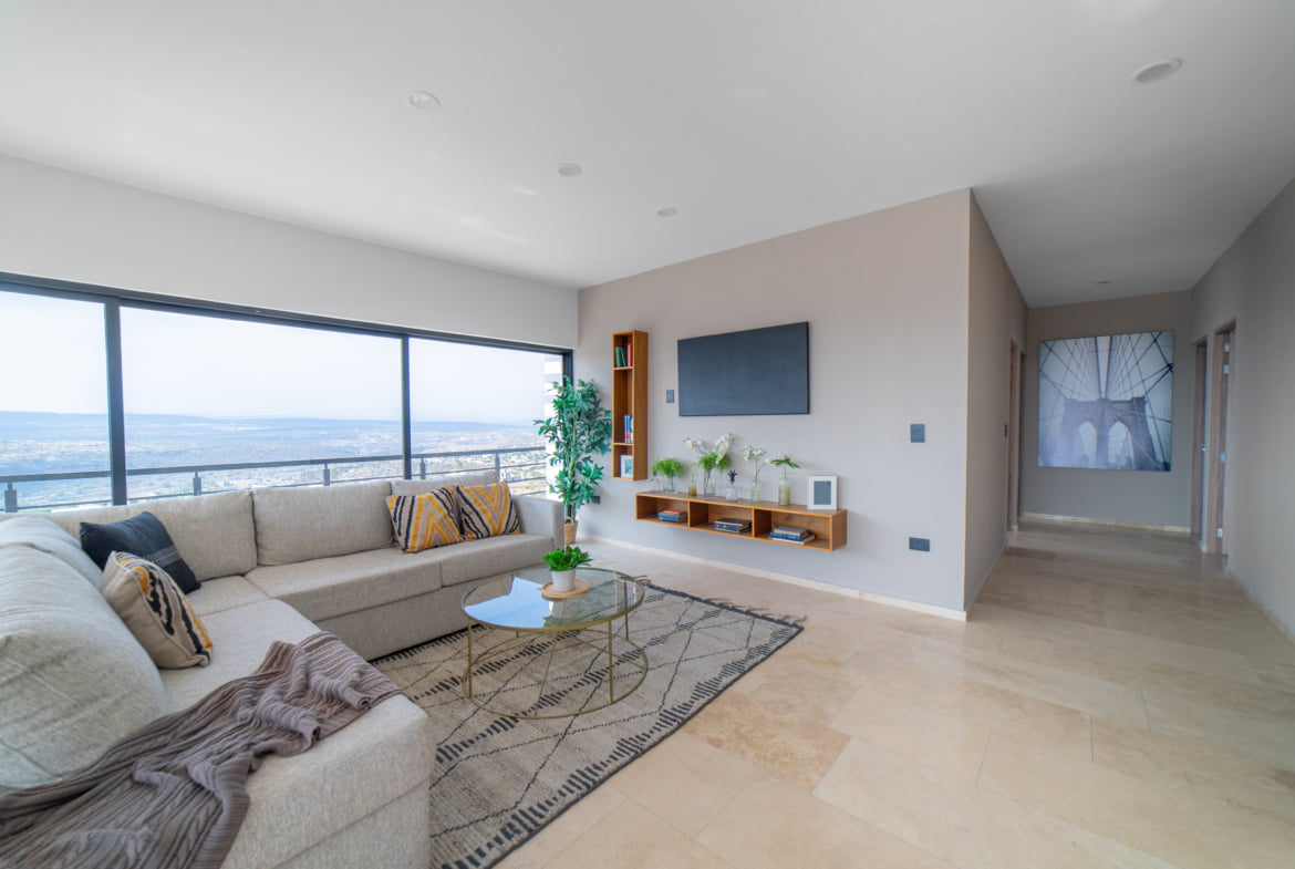 Situado en los costados de la torre, este amplio apartamento te recibe con un ambiente sofisticado y moderno, bañado en una excelente iluminación.
