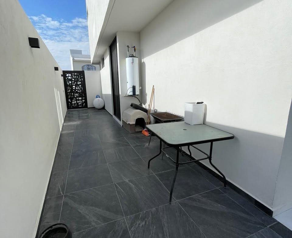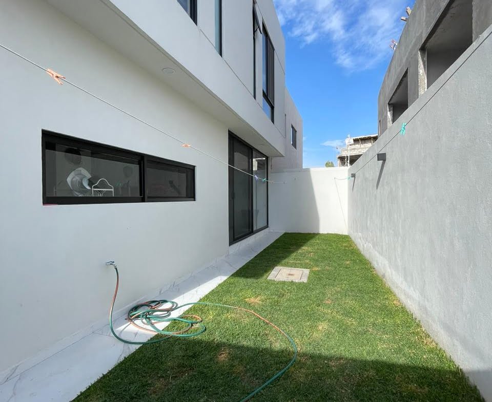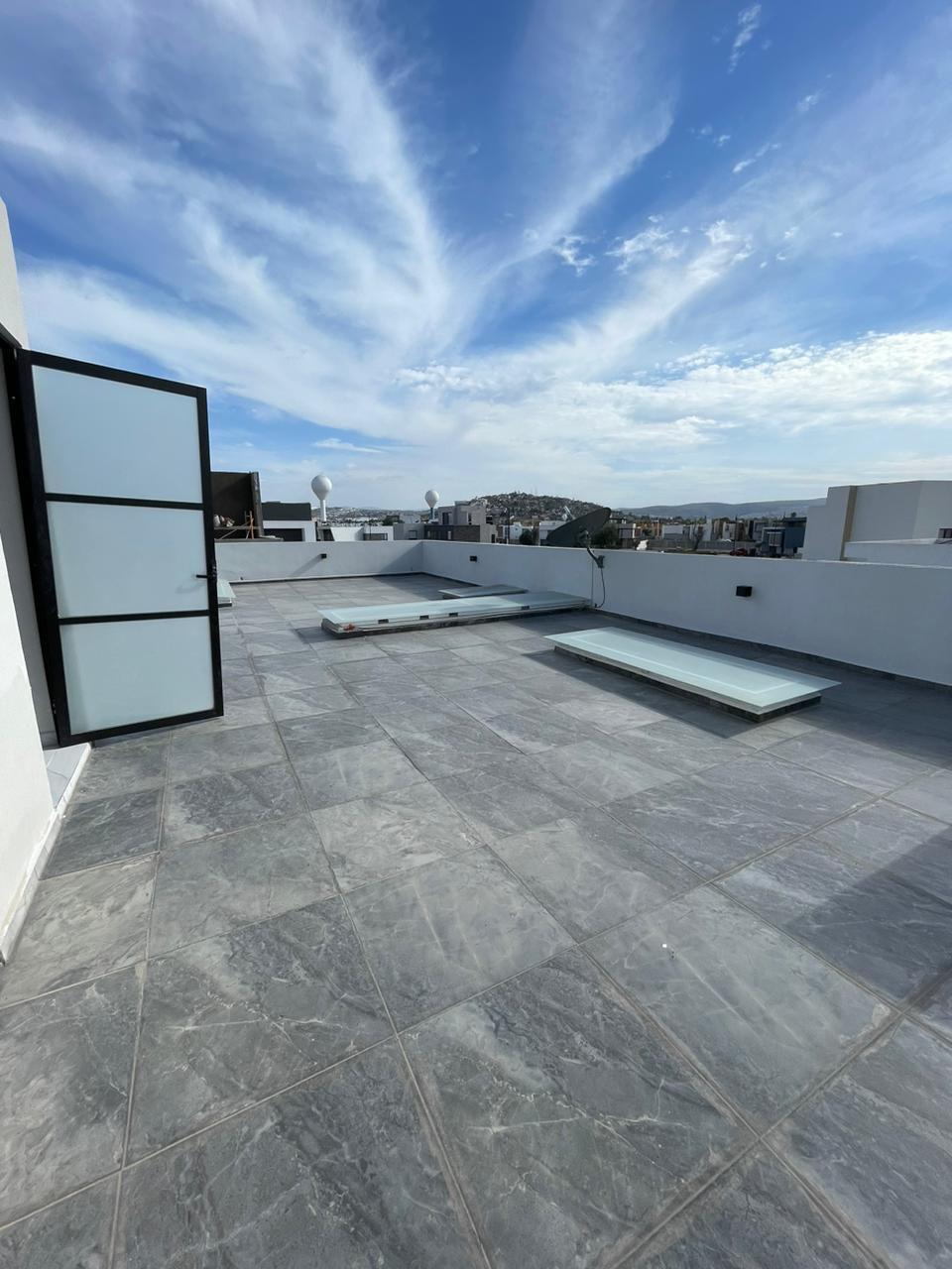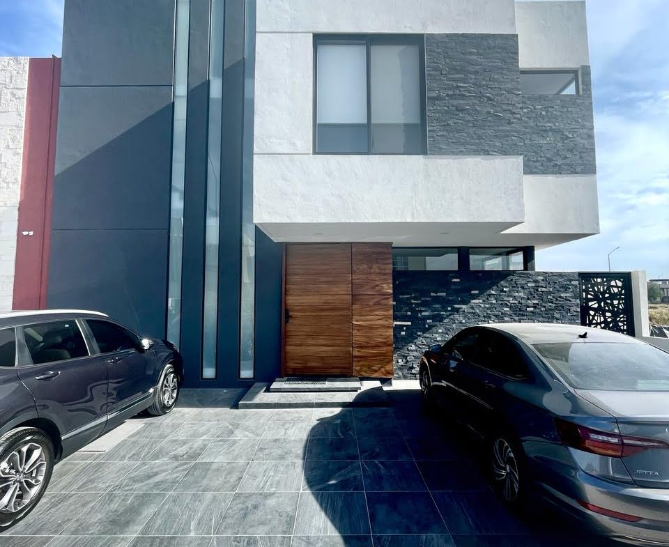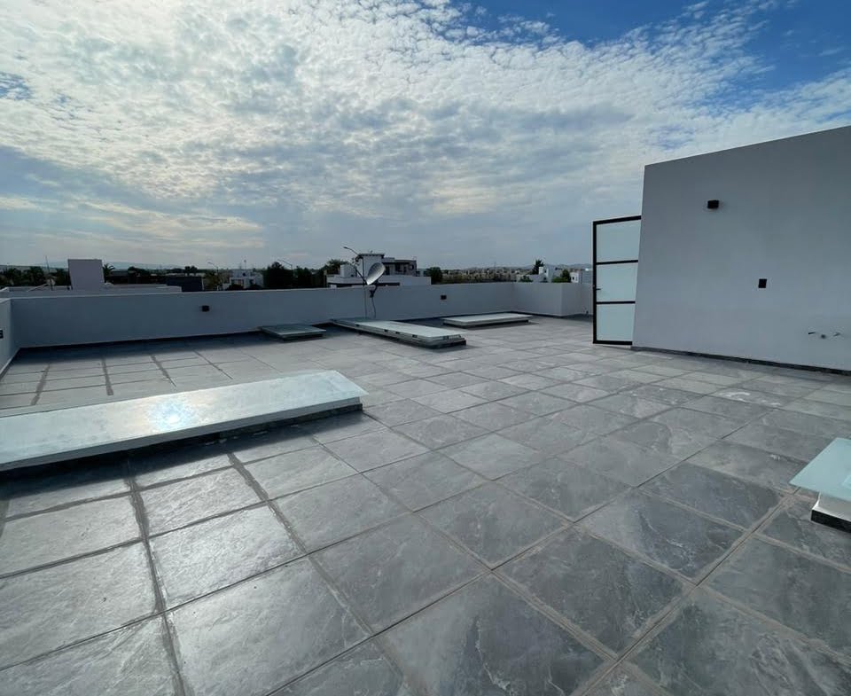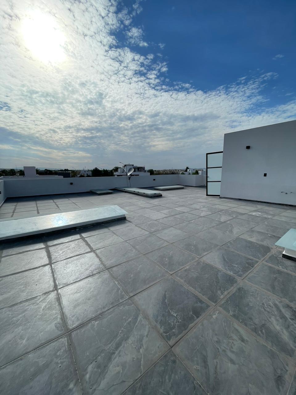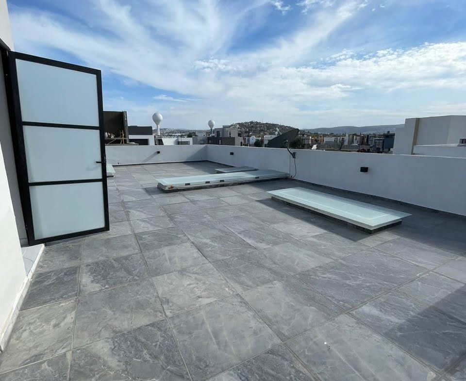 3 recámaras c/u con vestidor y baño completo, 2 medios baños, Espacio de sala doble altura, Espacio de comedor, Cocina equipada con cuarzo, Área de lavado, Patio trasero, Pasillo lateral con piso, 4 cajones de estacionamiento y Roof Garden.