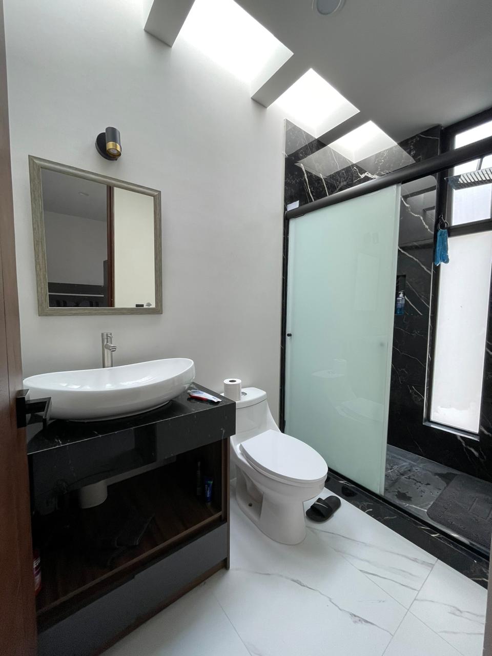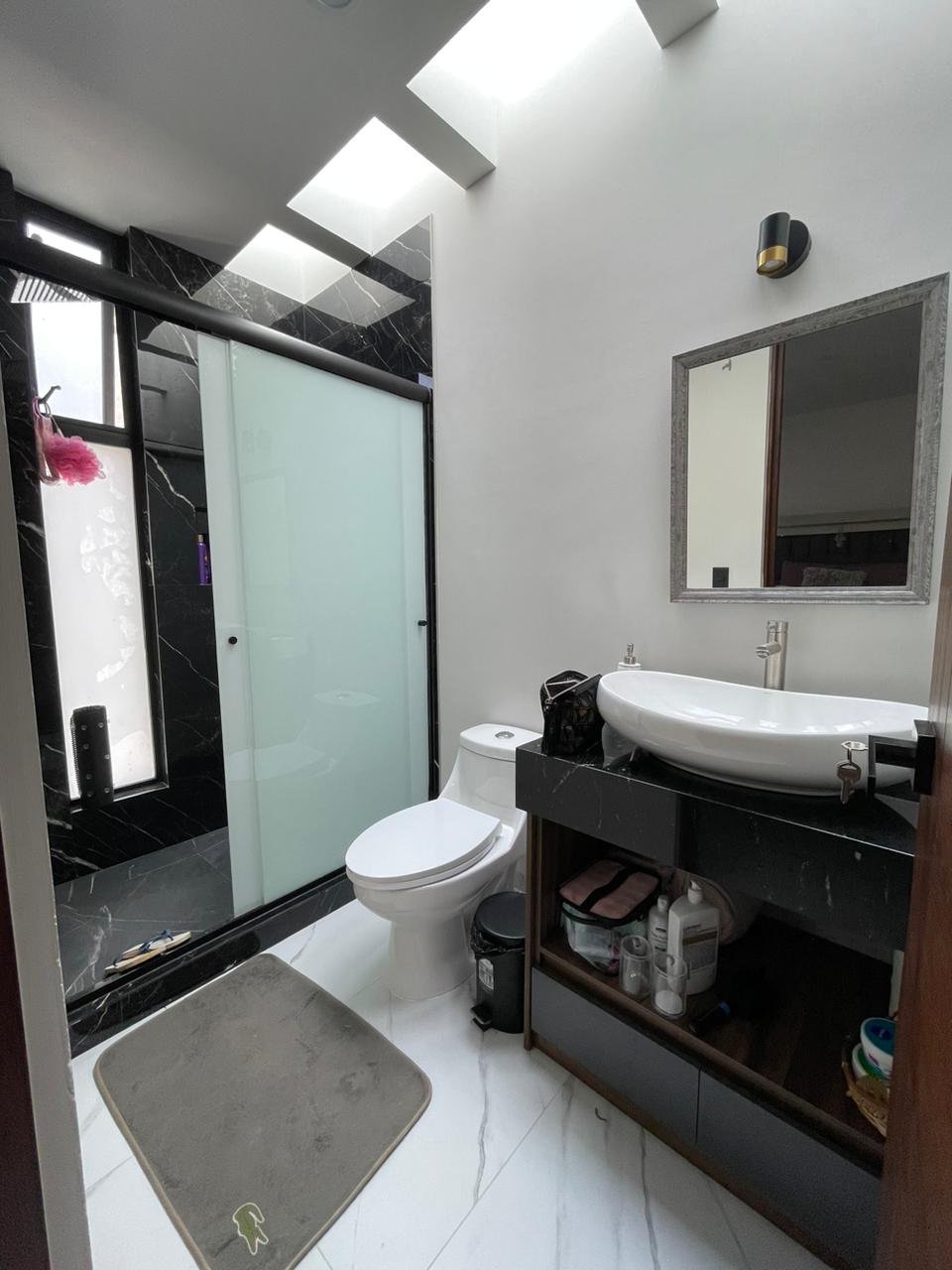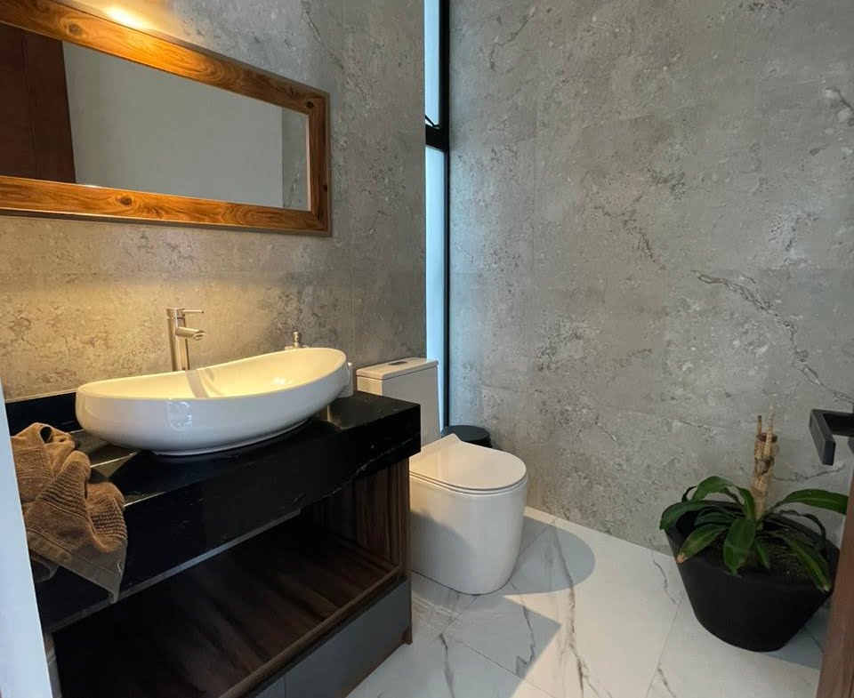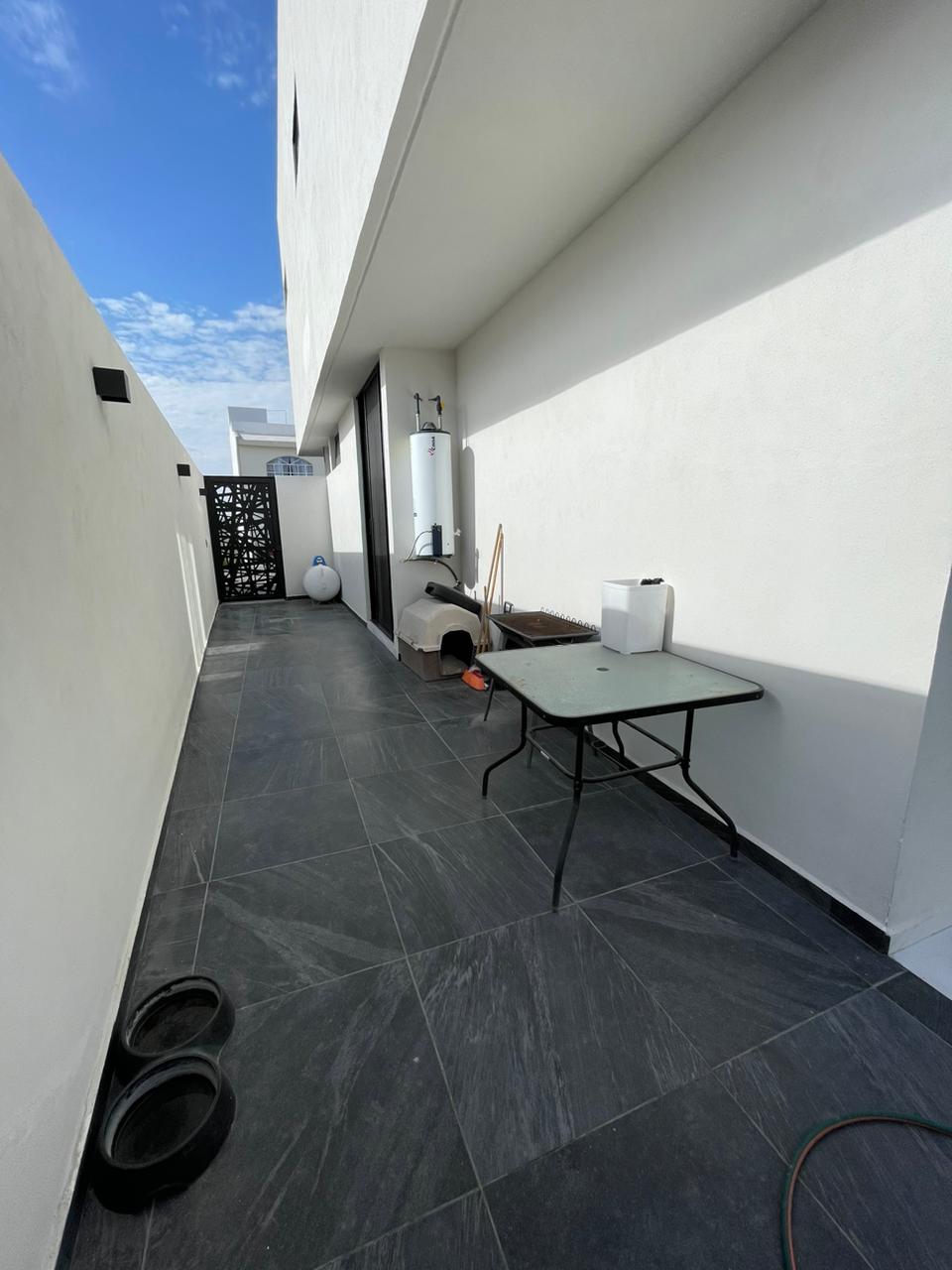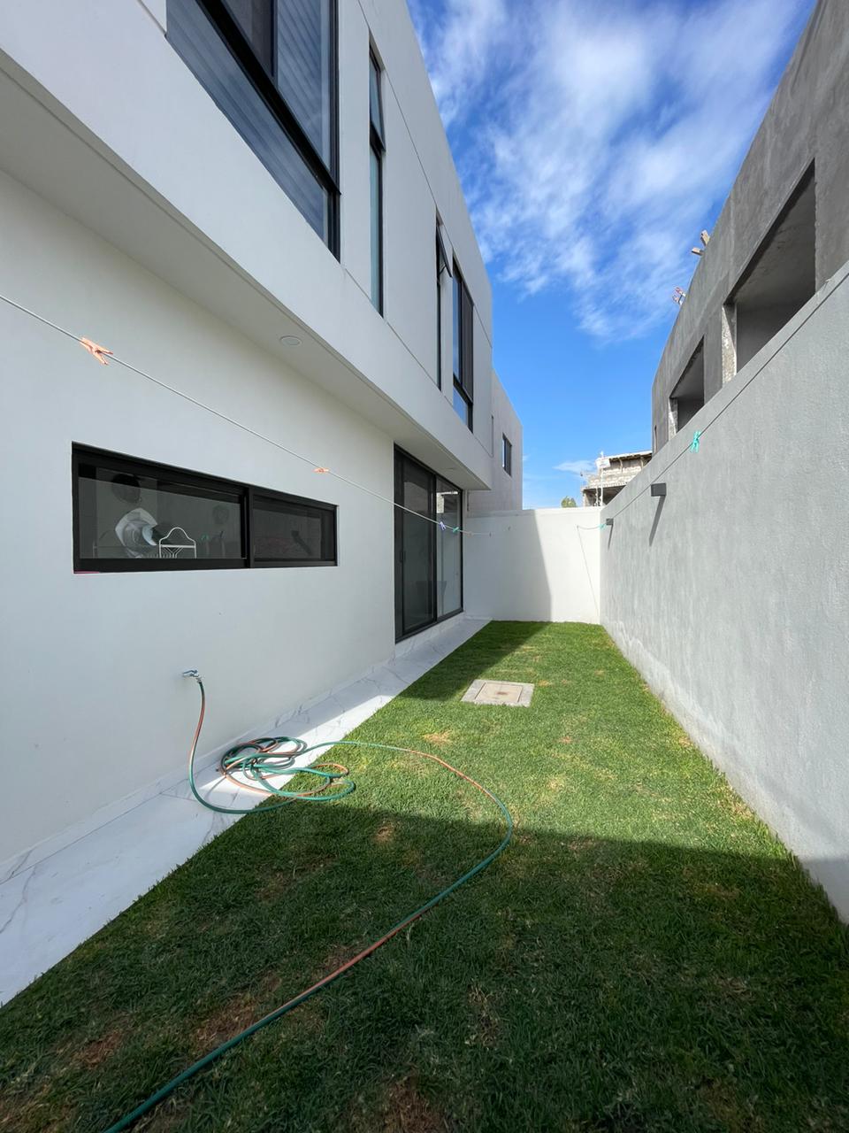 3 recámaras c/u con vestidor y baño completo, 2 medios baños, Espacio de sala doble altura, Espacio de comedor, Cocina equipada con cuarzo, Área de lavado, Patio trasero, Pasillo lateral con piso, 4 cajones de estacionamiento y Roof Garden.