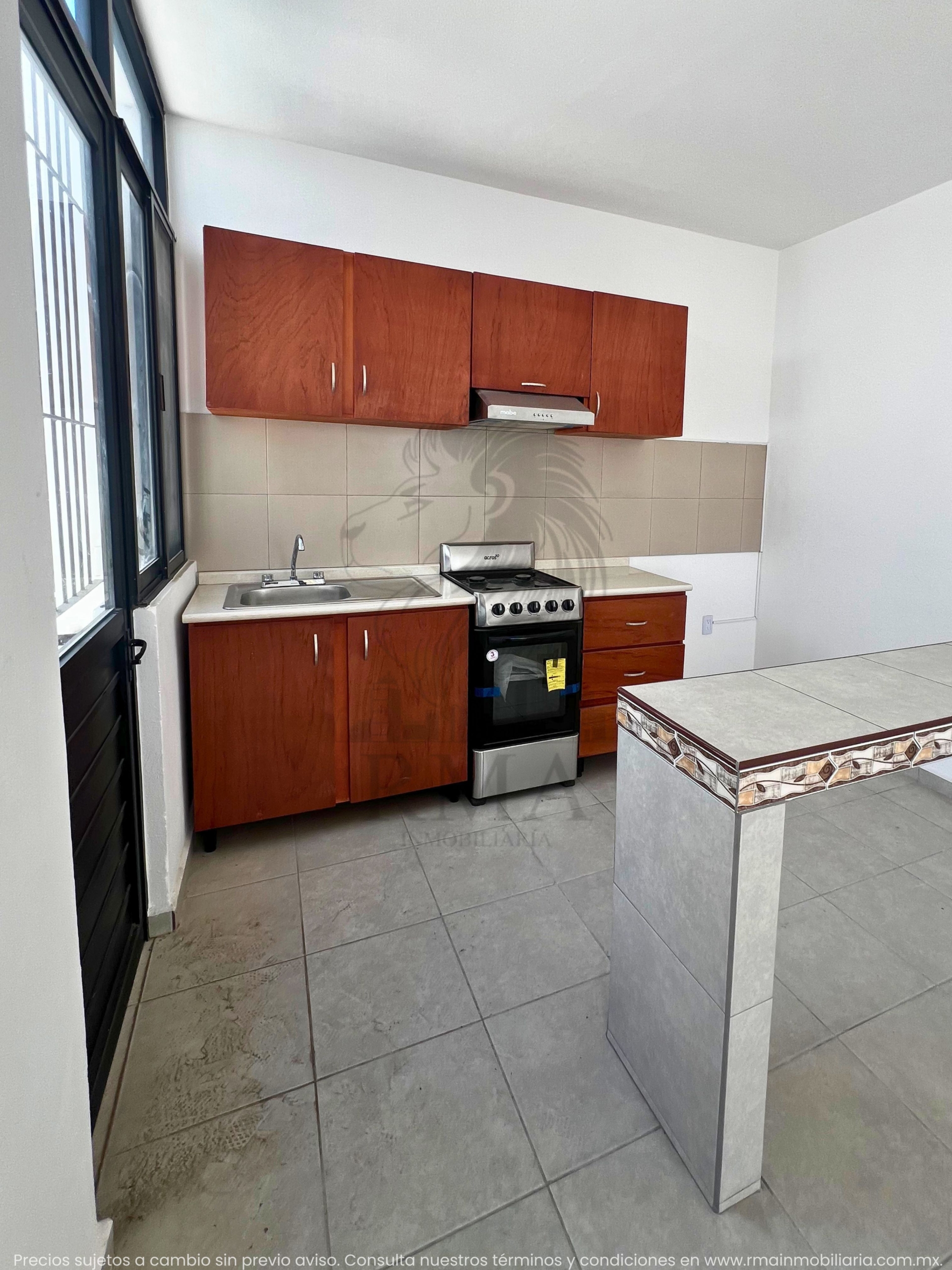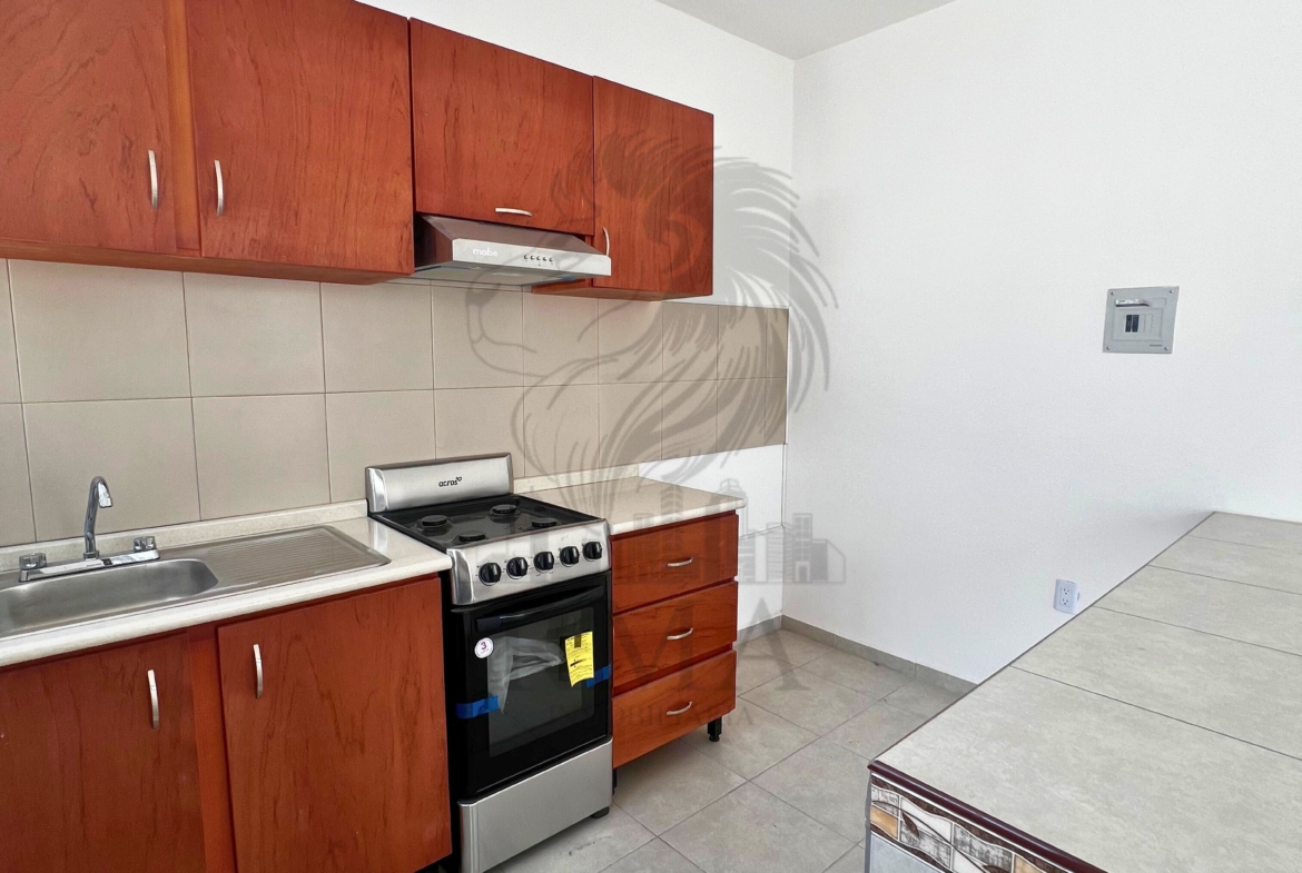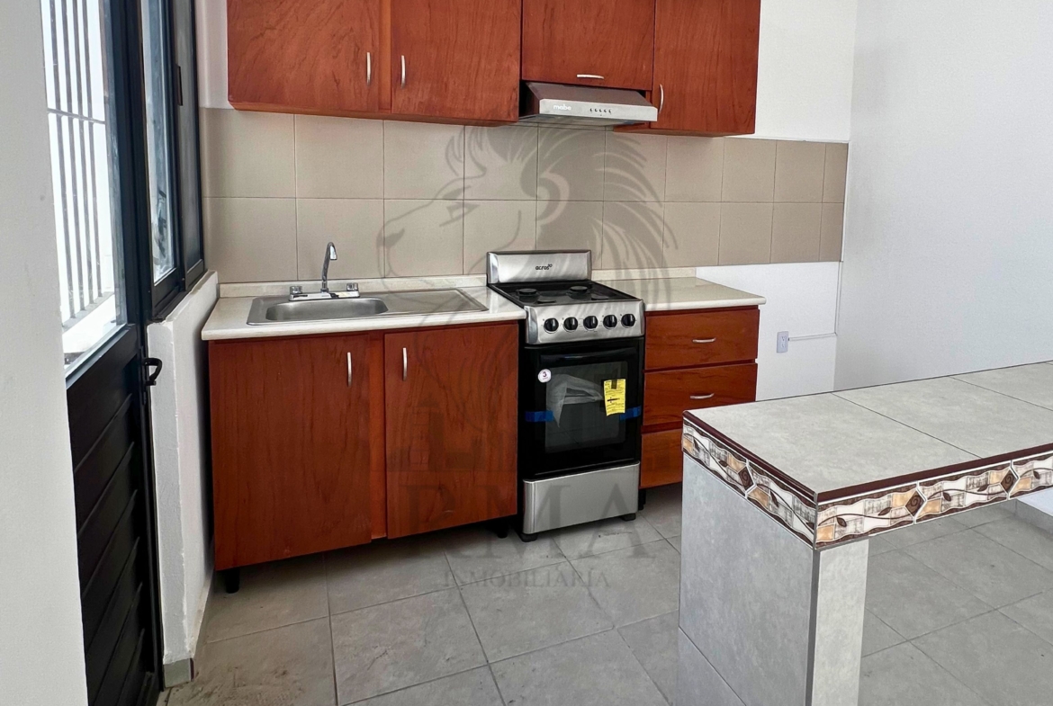 🍽️ Cocina equipada con fregadero, estufa y barra.