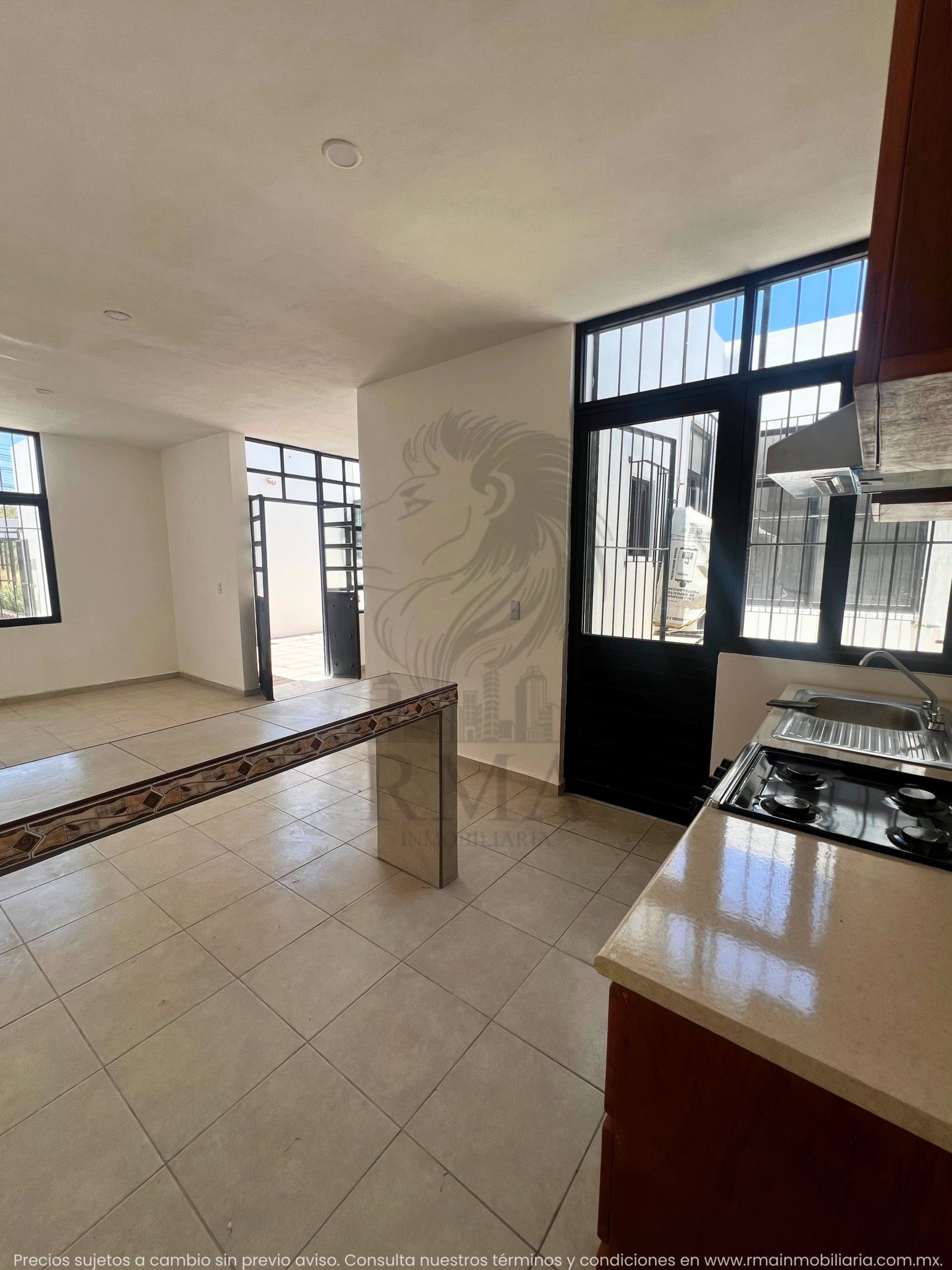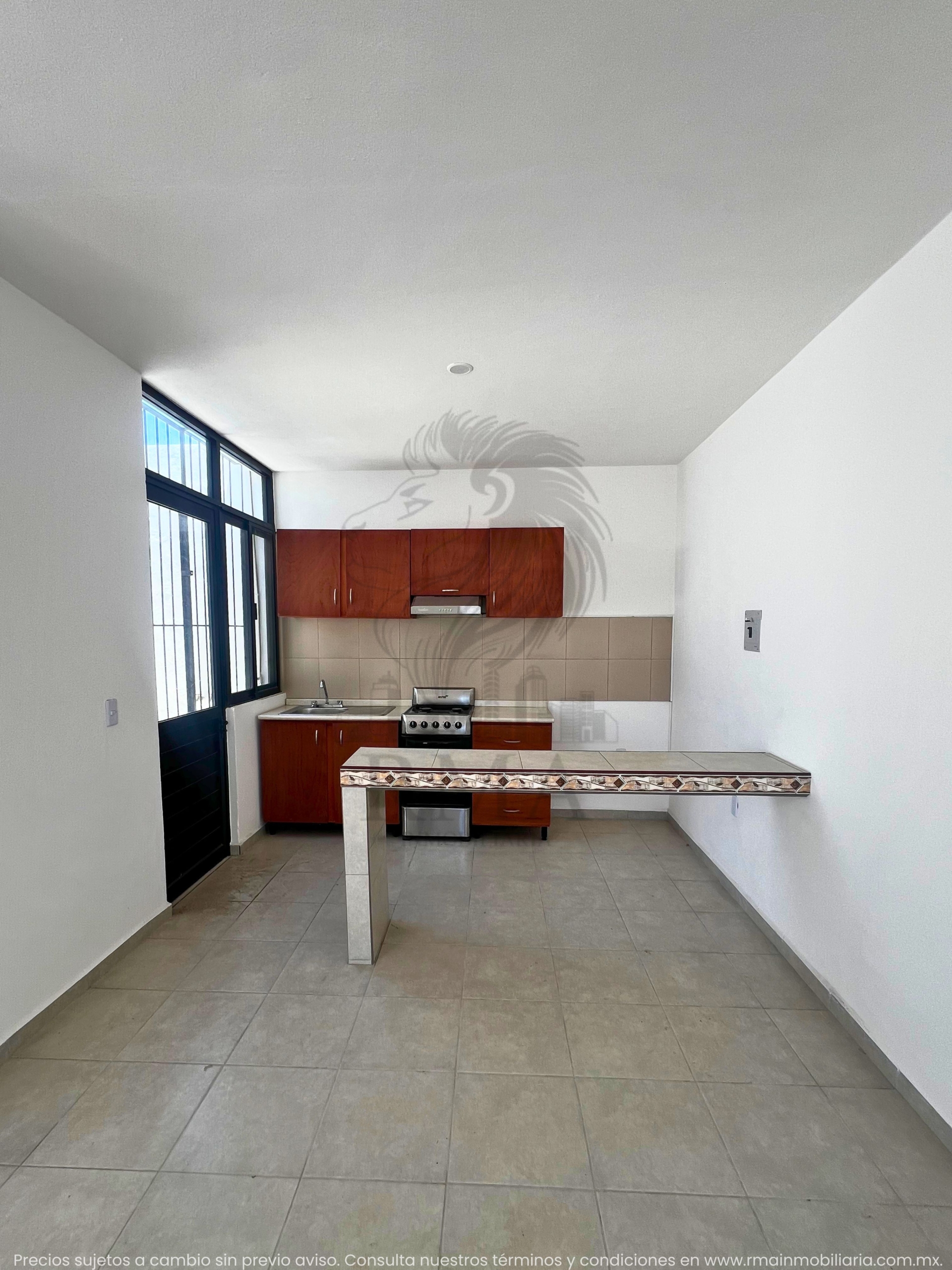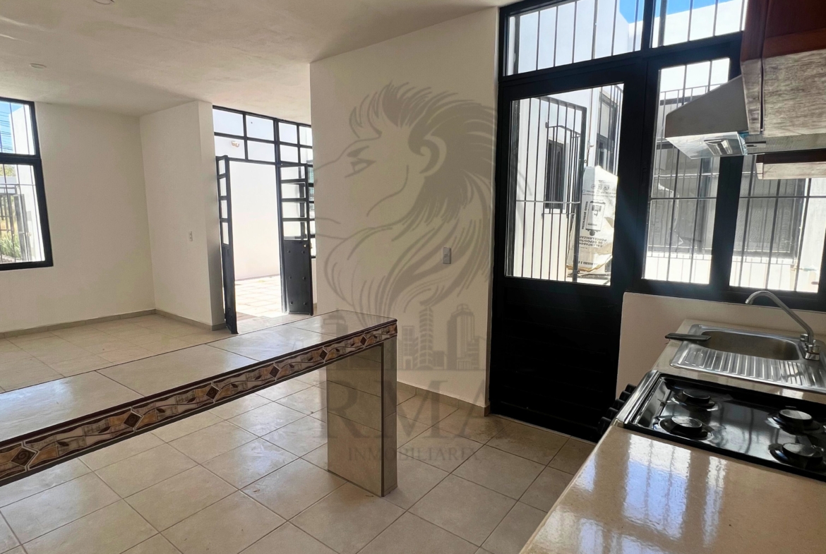 🍽️ Cocina equipada con fregadero, estufa y barra.